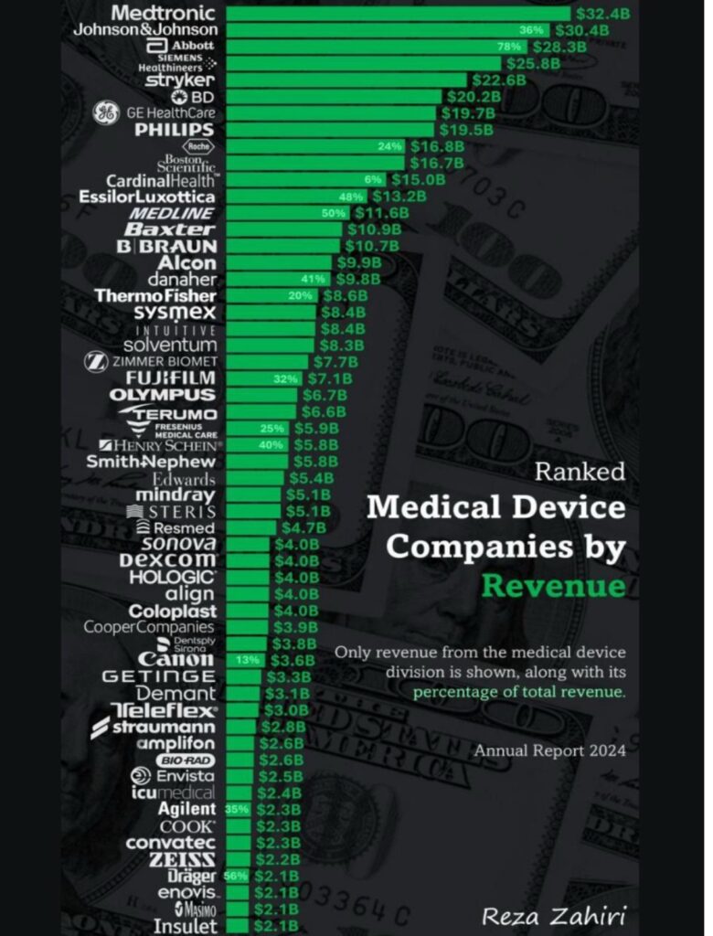 Segundo o Annual Report 2024, empresas como Medtronic, Johnson & Johnson MedTech, Siemens Healthineers, Stryker e Abbott figuram entre as líderes globais em dispositivos médicos.